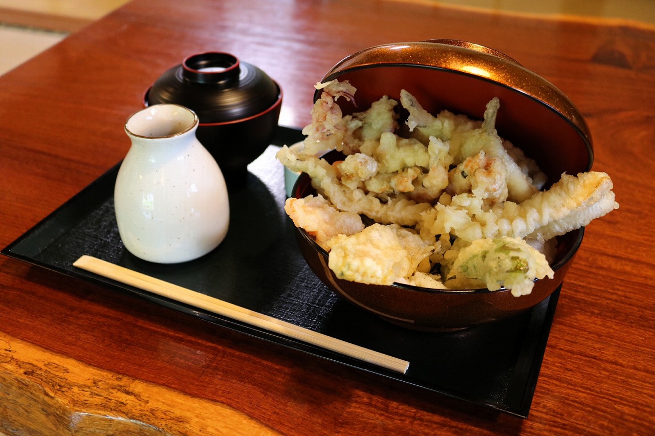 穴子、小えび、キス、ふぐ、帆立、烏賊ゲソ、野菜天など、数種類の海鮮をサクッと揚げて贅沢な丼物に。器の中には納まりきらないほど盛り付けられた天ぷらの迫力に、お子さまもお父様も大喜び間違いなしのボリューミーな一品です。もちろん揚げたてサクサクの天ぷらをほかほかご飯の上へいっぺんに盛り上げてお出ししております。